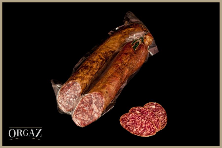 Embutido tradicional de España hecho con carne de cerdo ibérico de alta calidad. El salchichón ibérico se distingue por su intenso aroma y sabor, con un equilibrio perfecto entre la carne y las especias.